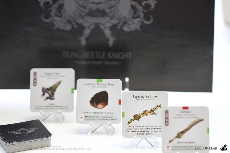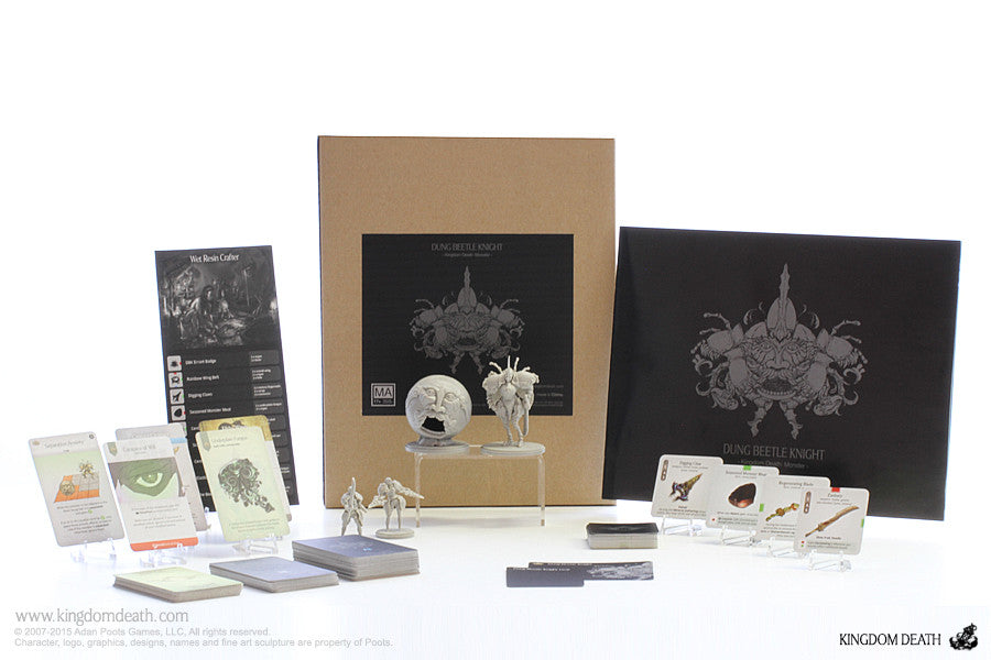 The Dung Beetle Knight is a node 4 quarry monster, a magnificent challenge for the most ambitious settlements late in their campaign. This expansion replaces nothing, no such level of challenge exists in the core Kingdom Death: Monster campaigns. It includes: