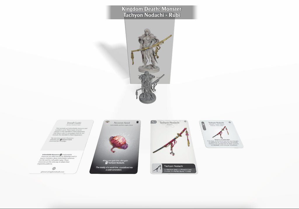 Rubi is a distinctly digital miniature that reacts to your armament choices! Rubi's miniature transforms when she is wielding her favored weapons in her gear grid. Rubi is well versed with all of the katanas found within Kingdom Death!