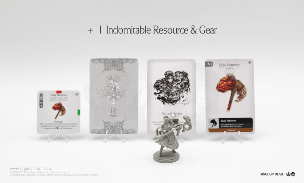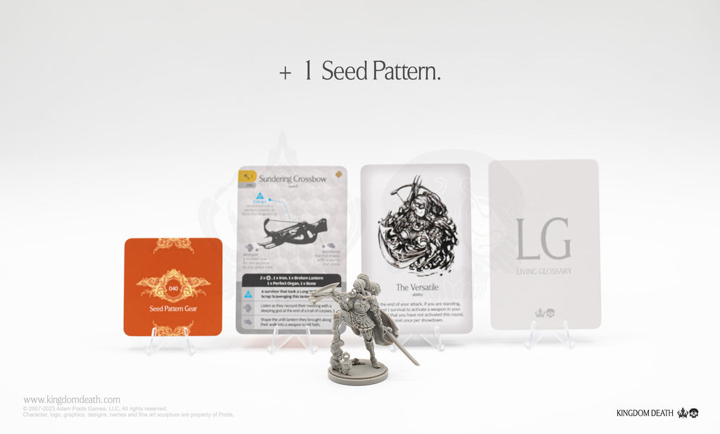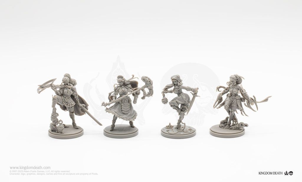 A celebration of survivors from Kingdom Death: Monster. Featuring four updated sculpts of strangers struggling to survive the darkness. This set includes a range of rules and tools representing the ways survivors might harness the world around them for their own gain. From indomitable resources to carve from the toughest monsters, to seed patterns of inspired design, to the knowledges of the arc survivors, this box celebrates all the advantages to be found in this meager existence.