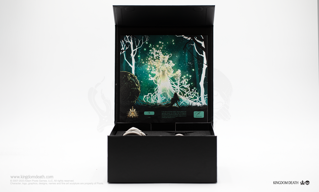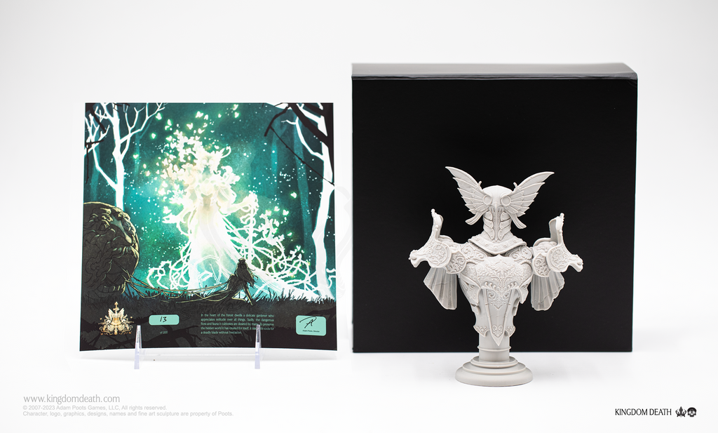 The Flower Knight Bust is packaged in a custom box customized with a signed Flower Knight art print and packed in custom cut foam:
